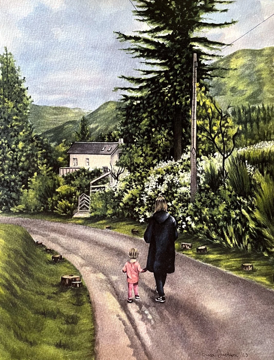 Like so many other places in Scotland we were captivated by the green of the surrounding hills, the white flowers blossoming from the bushes lining the path, and the calmness of the scene in general. A mother was taking her daughter on a short walk ahead of us, and I thought the scene was lovely and perfect for a painting. This piece was the result, and I enjoy looking at it and remembering the tranquility of that moment.